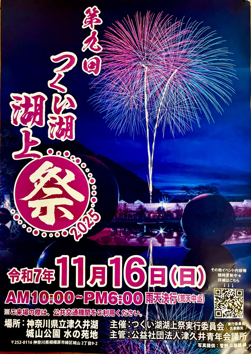 2025年11月16日(日)、津久井湖のほとりにある城山公園水の苑地で『第9回つくい湖湖上祭』が開催されます。紅葉が色づく秋の湖畔に、冬の花火が打ち上がる特別な一日。地元グルメやステージイベントも盛りだくさん!自然と人のにぎわいを感じる秋の風物詩です。