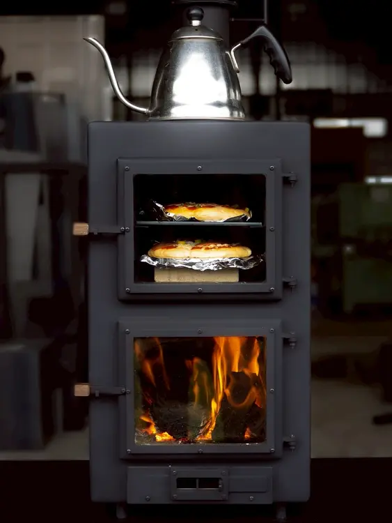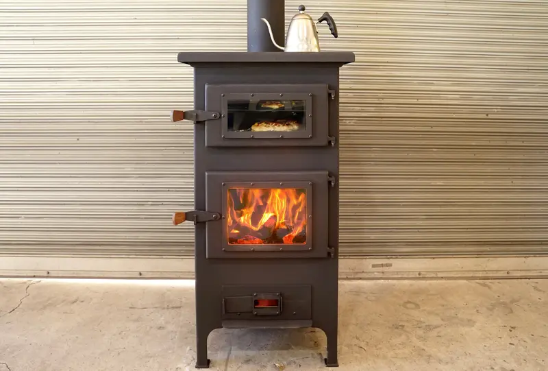 暖房&調理可能なクッキング用薪ストーブ。オーブン室ではピザを焼け、トップではお湯が沸かせます。サイズw300xh550xd360/重量50Kg。
