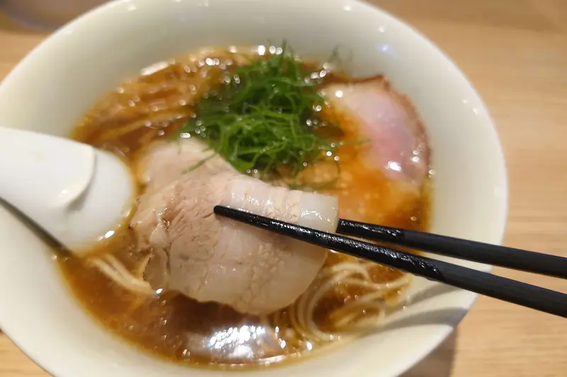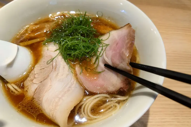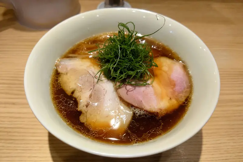 『中村麺三郎商店』の看板商品。澄んだ醤油スープに煮豚と焼豚の2種類のチャーシュー、ネギ、メンマが添えられています。無化調ならではの自然な旨みに、生醤油のキレが合わさった独特の味わいが魅力です。
