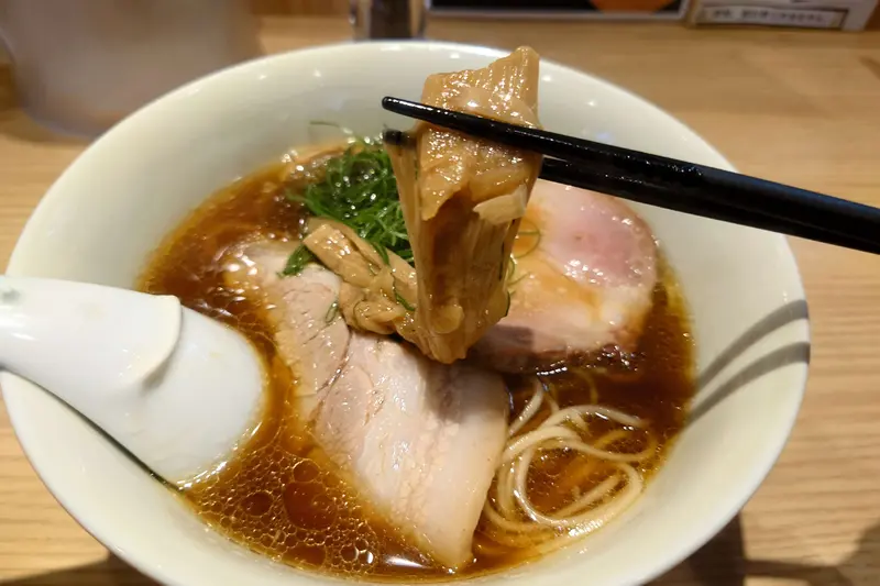 大ぶりのメンマは柔らかく、噛むと出汁の味がじんわり広がります。スープと調和し、全体のバランスを整えています。